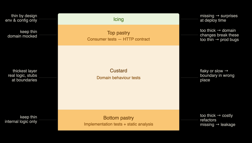 The Custard Slice is opinionated about design, not just testing. It implies clear separation between domain logic and transport, between behaviour and implementation, and between what your software does and how it’s deployed. Each layer enforces a different kind of boundary, and violations of those boundaries show up as symptoms in the layer that’s wrong.